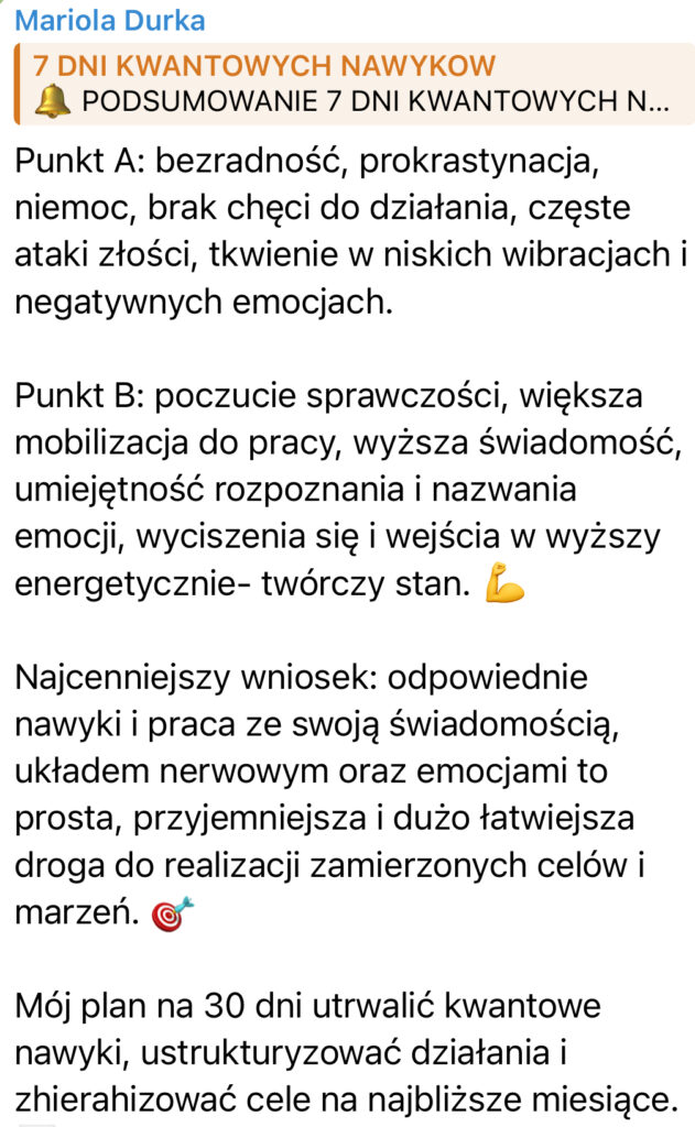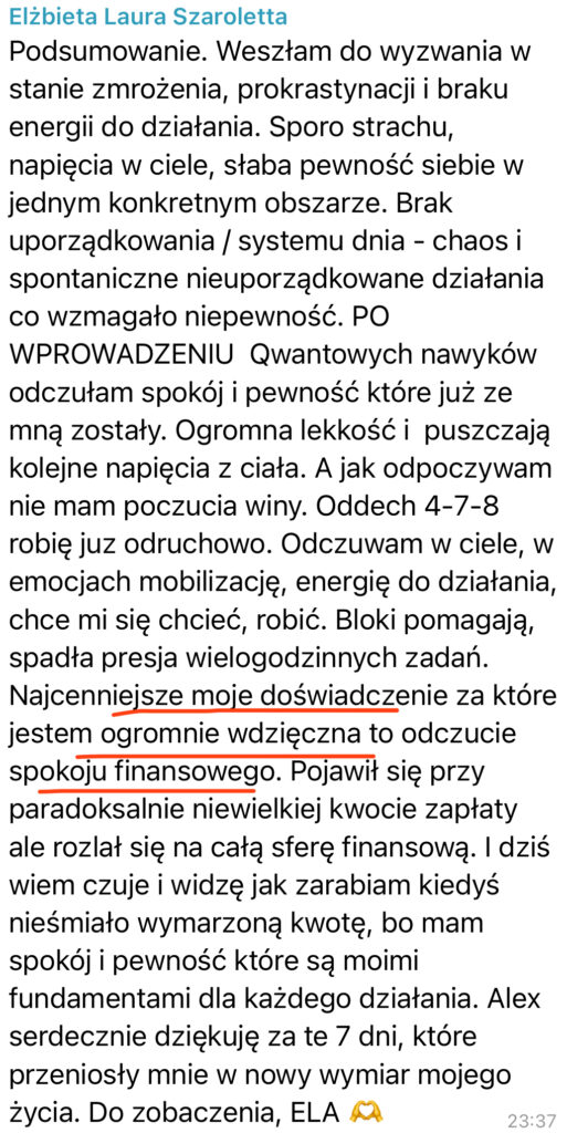 Każde zadanie zajmie Ci 20-30 minut. Możesz słuchać audio w drodze do pracy. Jedna uczestniczka robiła zadania podczas przerwy na kawę. Po 7 dniach miała gotowy system.