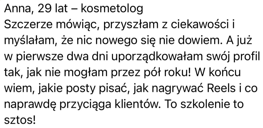 Moi uczestnicy myśleli tak samo. Teraz mają po 9 nowych klientów miesięcznie. Instagram to narzędzie – Ty decydujesz, czy do zabawy czy zarabiania.