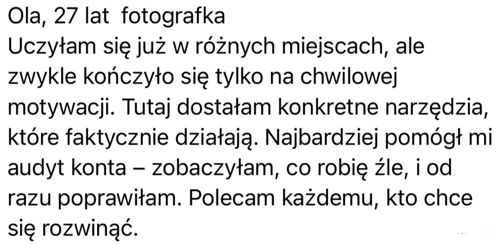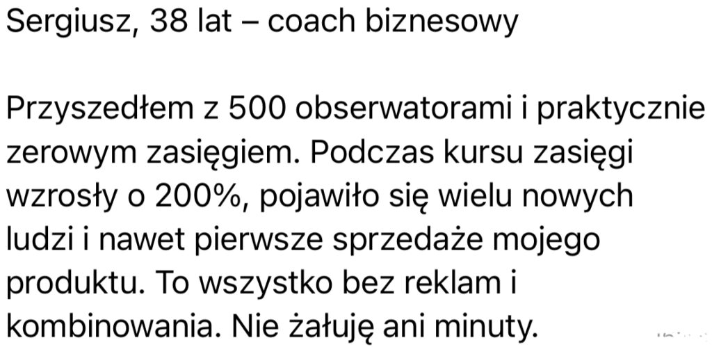 Jeśli wykonasz zadania – zadziała. To nie magia, tylko sprawdzona metoda. Uczestniczka z 800 obserwatorów zwiększyła zasięgi o 320%.